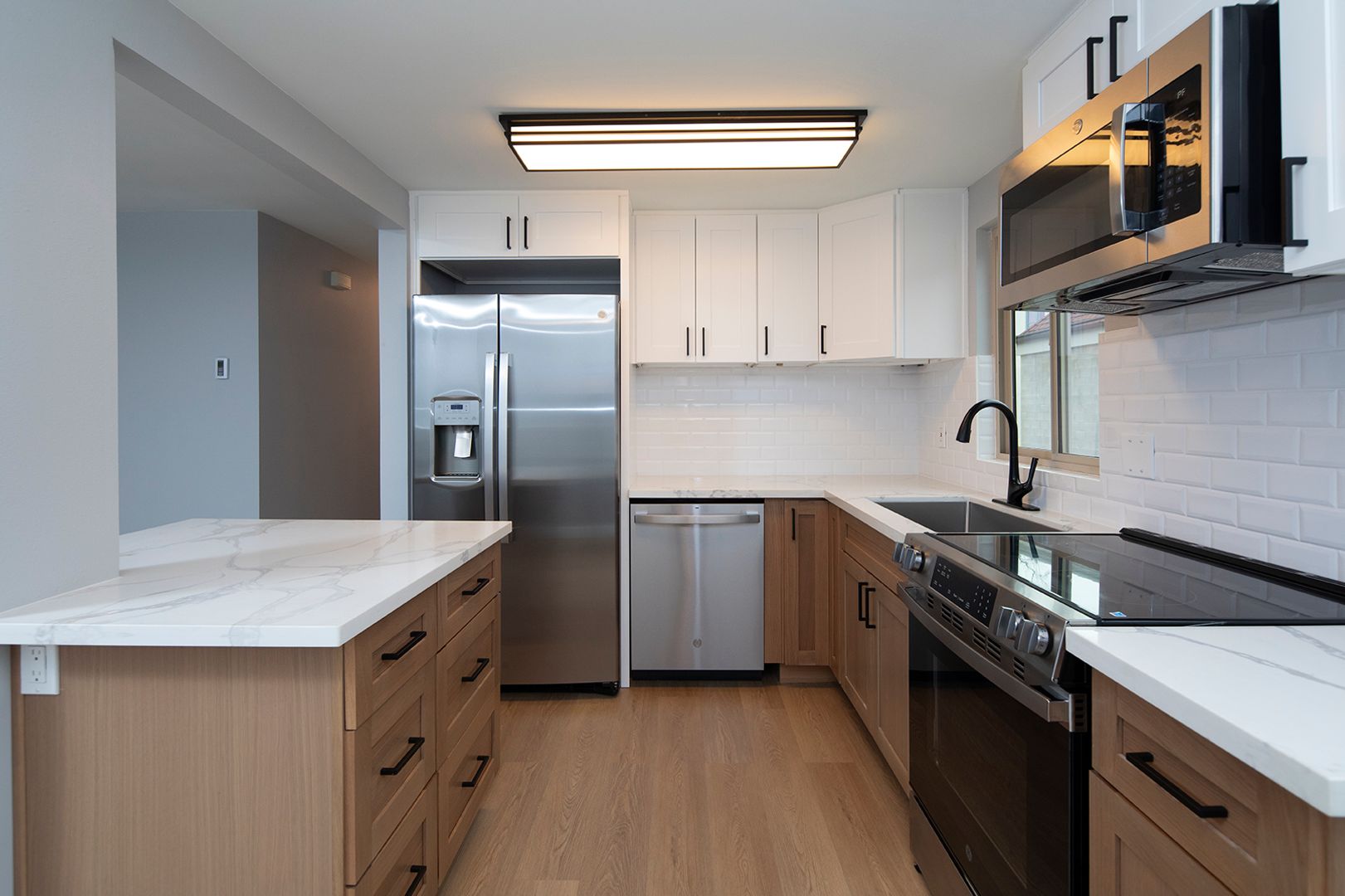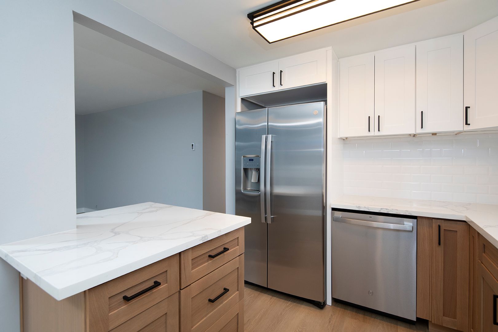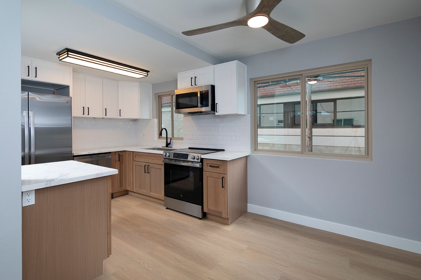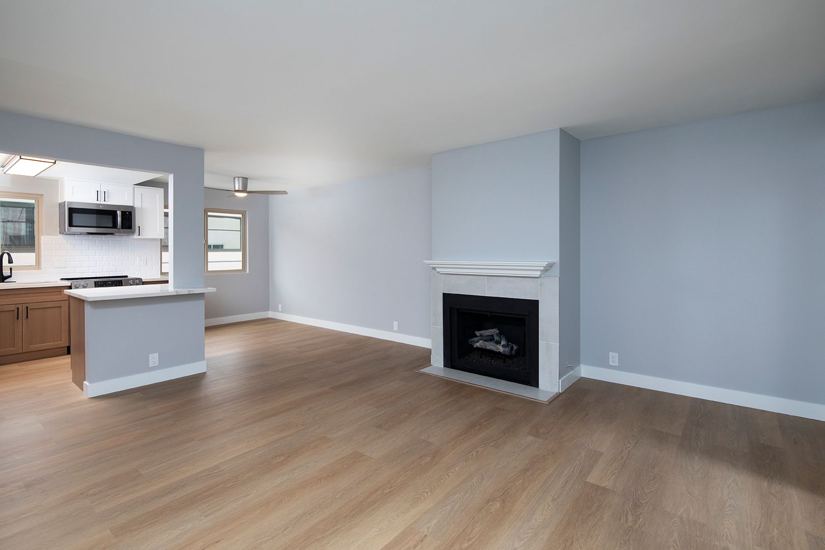Experience coastal living in this BRAND NEW 2 bedroom, 2 bathroom apartment home located in a beautiful 12-unit community in the heart of La Jolla Village. This fully renovated residence features a thoughtfully designed kitchen with quartz countertops, modern backsplashes, stainless steel appliances, a dishwasher, and a french door-style refrigerator complete with ice and water dispensers. The apartment showcases new hard surface flooring, a cozy fireplace, and a washer and dryer conveniently located in-unit. Both bathrooms have been completely renovated with modern walk-in showers finished in classic subway tile, creating a clean and contemporary feel. Additionally, new windows are scheduled to be installed by the end of the year.